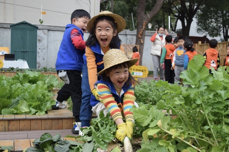 徐汇区果果幼儿园的孩子们在“果宝农庄”里采摘丰收的萝卜。