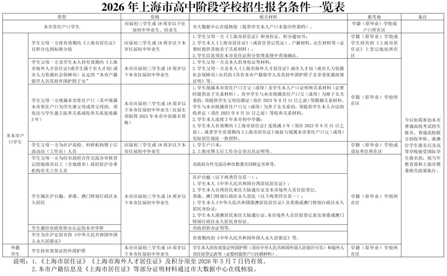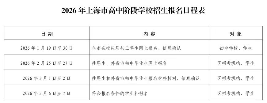 应届生可于1月19日(星期一)10:00起至1月30日(星期五)12:00,登录上海市教育考试院“上海招考热线”网站(www.shmeea.edu.cn)进行网上报名。请学生和家长(监护人)按照《2026年上海市高中阶段学校招生报名日程表》(详见↓)上的时间,根据学籍学校的统一安排进行网上报名和信息确认。学生务必在规定时间内完成网上报名,若在操作过程中遇到问题,请及时与学籍学校联系,由学校协助完成报名。