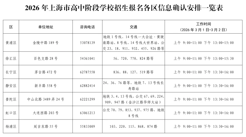 往届生和返沪生完成网上报名后,须于3月1日(星期日)至3月2日(星期一)前往报名所在区的招考机构28圈注册,现场确认报名信息,确认时须带好报名证明材料(各区确认地点和时间,证明材料要求见下方)。